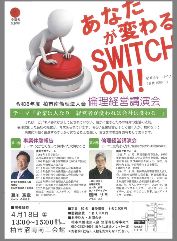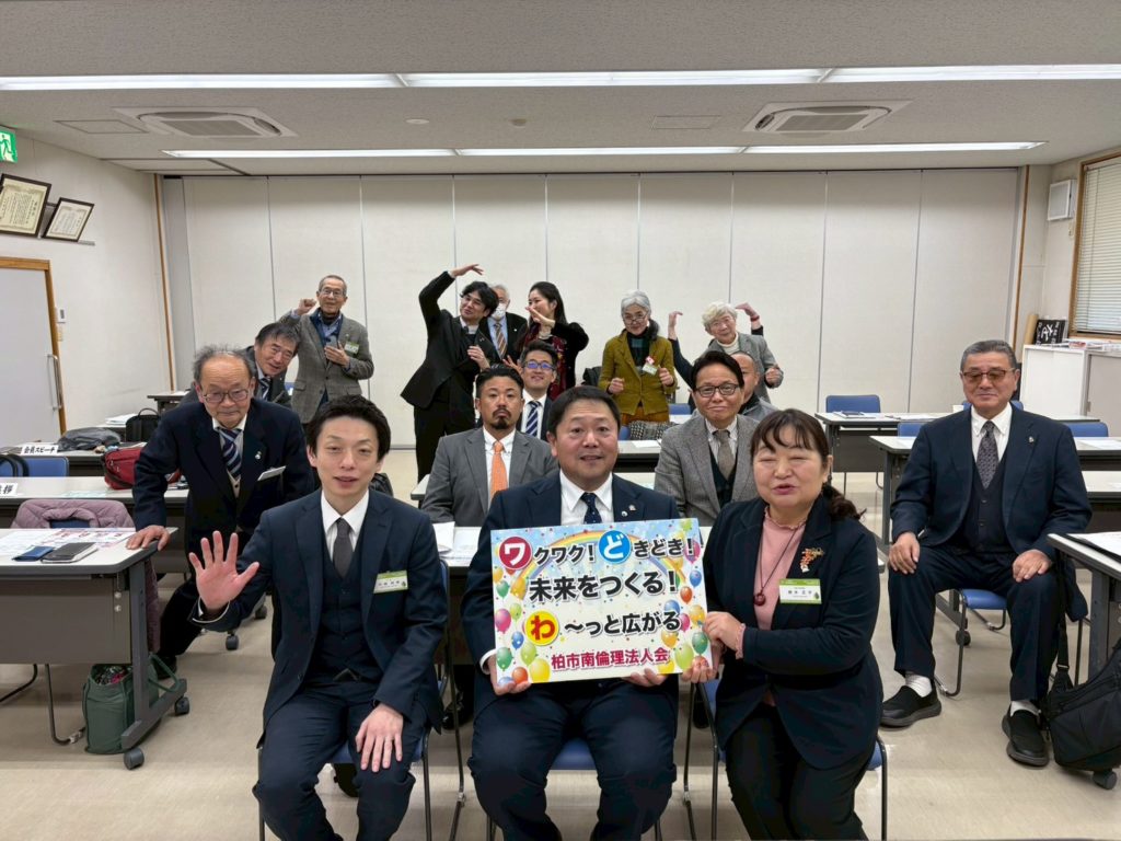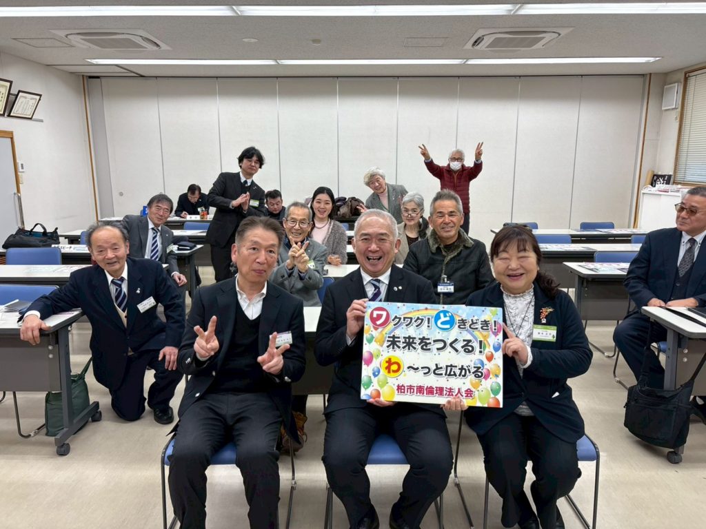 柏市南倫理法人会は、一般社団法人倫理研究所の法人会員組織・千葉県倫理法人会に属する経営者ネットワークを作り、多くの会員同士の出会いと繋がりを大切にし、「企業に倫理を 職場に心を 家庭に愛を」をスローガンに、まず経営者自信が純粋倫理を学び、活力に満ちた人間に変わることによって、社員が変わり、社風が変わり、自社の繁栄を目指し、地域社会を明るくして行く会になります。