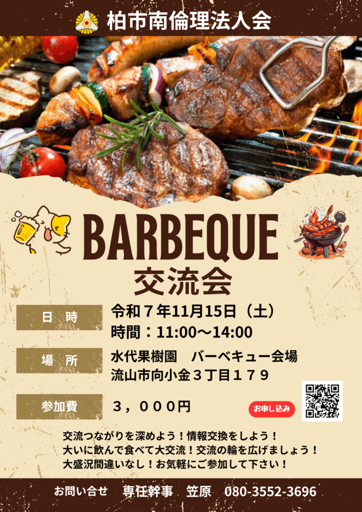 令和8年11月15日(土)に柏市南倫理法人会主催異業種大交流BBQ大会を水代果樹園にて開催致します。