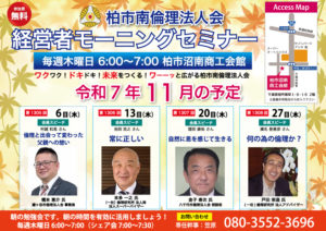 柏市南倫理法人会では、毎週恒例の「経営者モーニングセミナー」を開催しています。