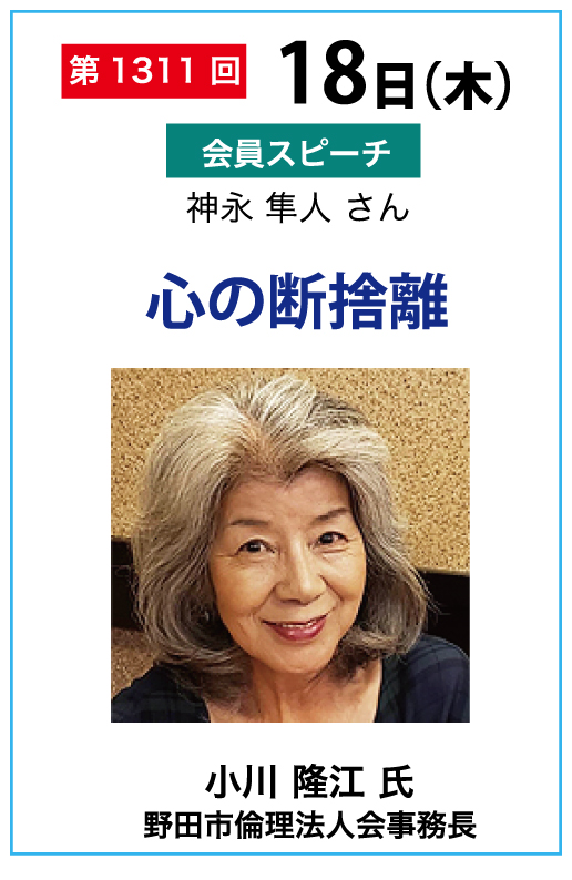 講師は野田市倫理法人会事務長 小川 隆江 氏をお迎えします。
