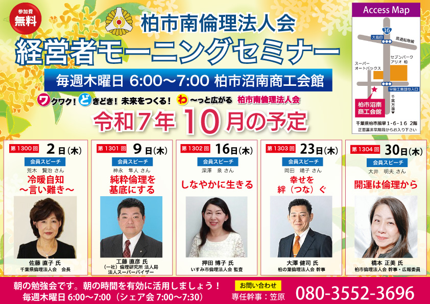柏市南倫理法人会では、毎週恒例の「経営者モーニングセミナー」を開催しています。2025/11/ 13(木)は第1306回経営者モーニングセミナーを開催致します。講師は一般社団法人倫理研究所 法人局 本多 一之 氏をお迎えします。 講師紹介 モーニングセミナー... -